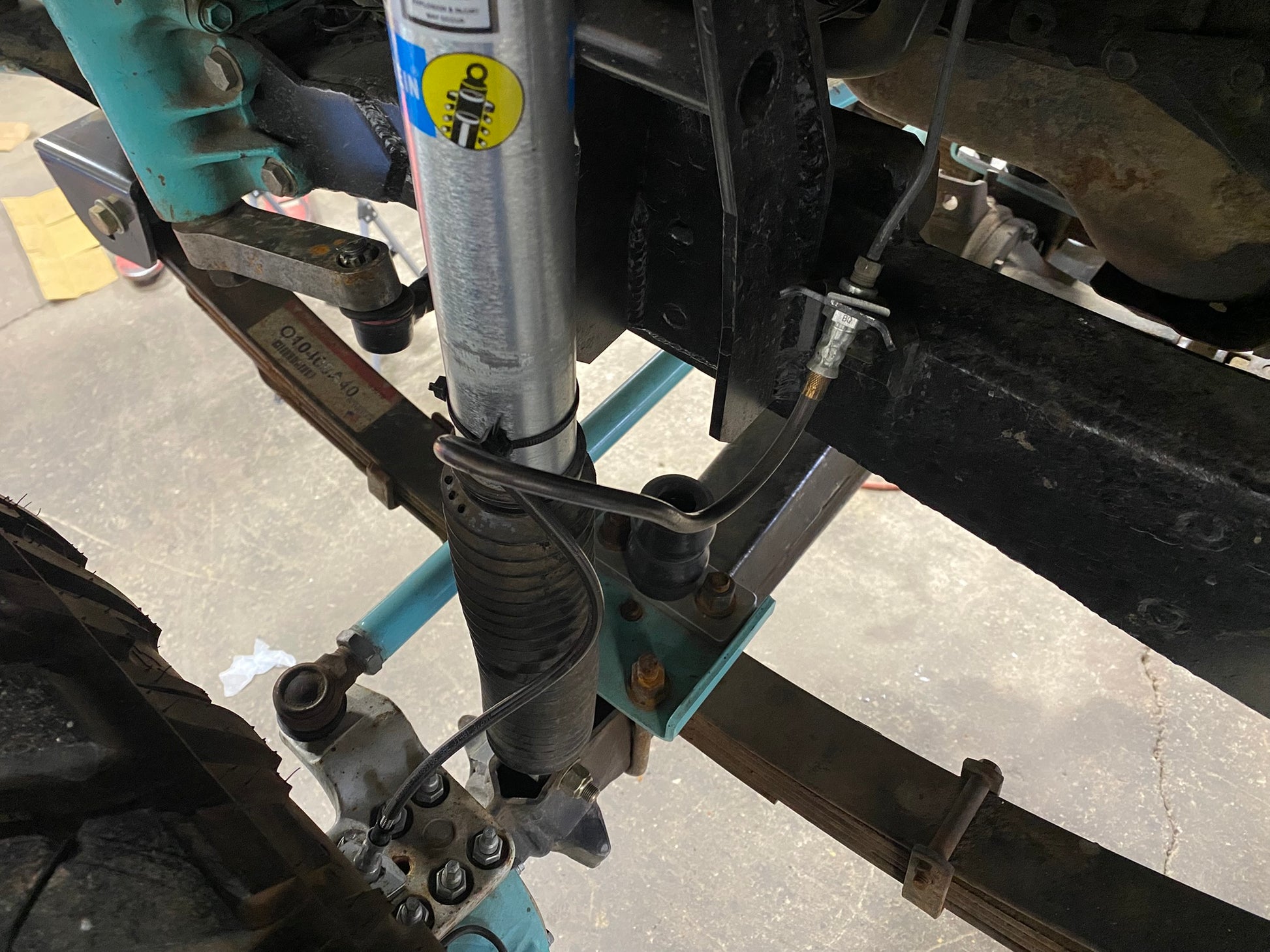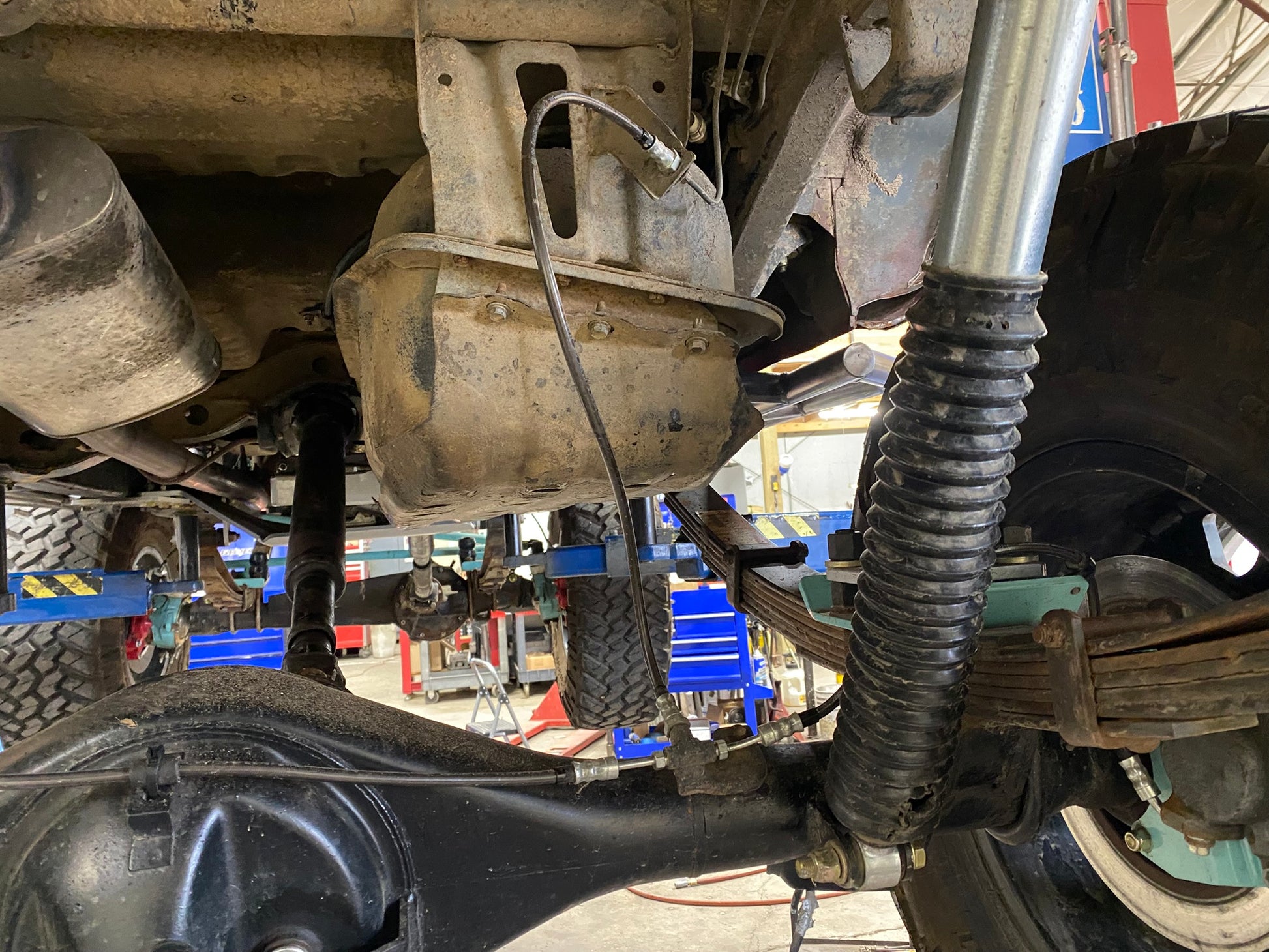 Toyota mini truck, solid axle equipped brake lines.