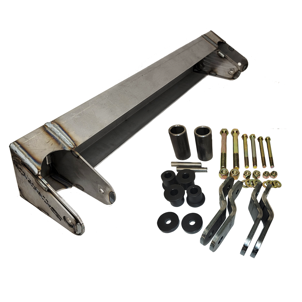 Front leaf hanger is 3/16th steel with a 3/16th skeleton brace, making it effectively 1/2" plate strength. Shackles are 3/8ths plate. Frame tube is 2x.250 wall DOM.  Kit uses a special machined UHMW bushing and 3/4" bolt for the frame tube for long life, and less bushing sway.