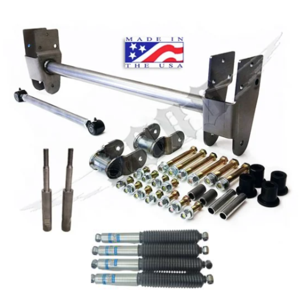 This kit includes everything you will need to complete the 2" front shackle reversal on a 92-97 F350 4x4 including longer shocks, an adjustable panhard (track) bar and sway bar end link extensions